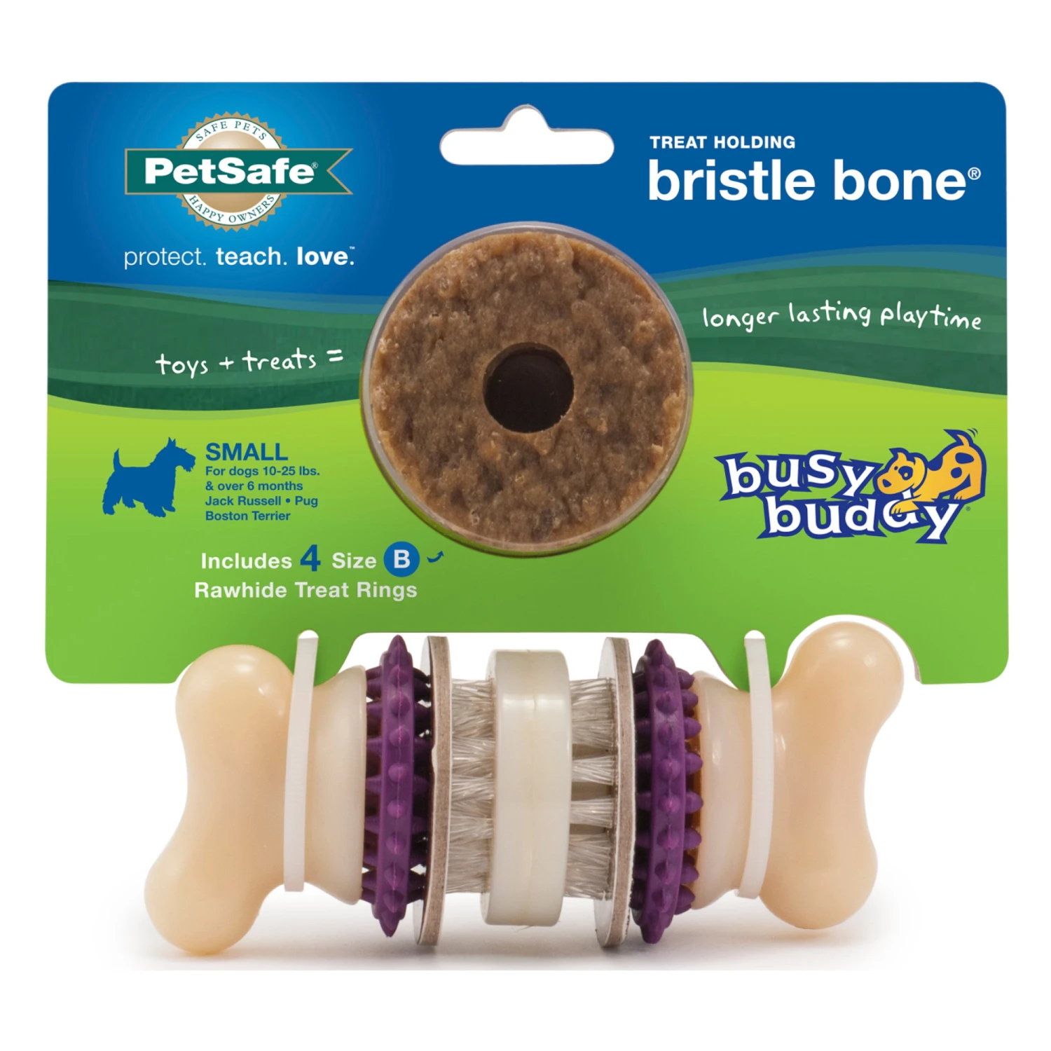 Let your dog brush his own teeth while he’s having a blast playing with the PetSafe® Busy Buddy® Bristle Bone®. It has 3 chewing surfaces and a treat ring for your dog to chew on. The rubber nubs and nylon bristles to help stimulate gums and keep teeth clean. This toy also includes 4 Busy Buddy® treat ring refills (additional treat ring refills available separately). Designed for tough chewers, this fun toy is made from durable nylon and heavy-duty rubber. It’s safe your pet, easy to clean and top-shelf dishwasher safe. Choose from extra small, small, medium and large sizes. For dogs over 6 months old. PetSafe® brand is here to help you and your pet live happy together™.