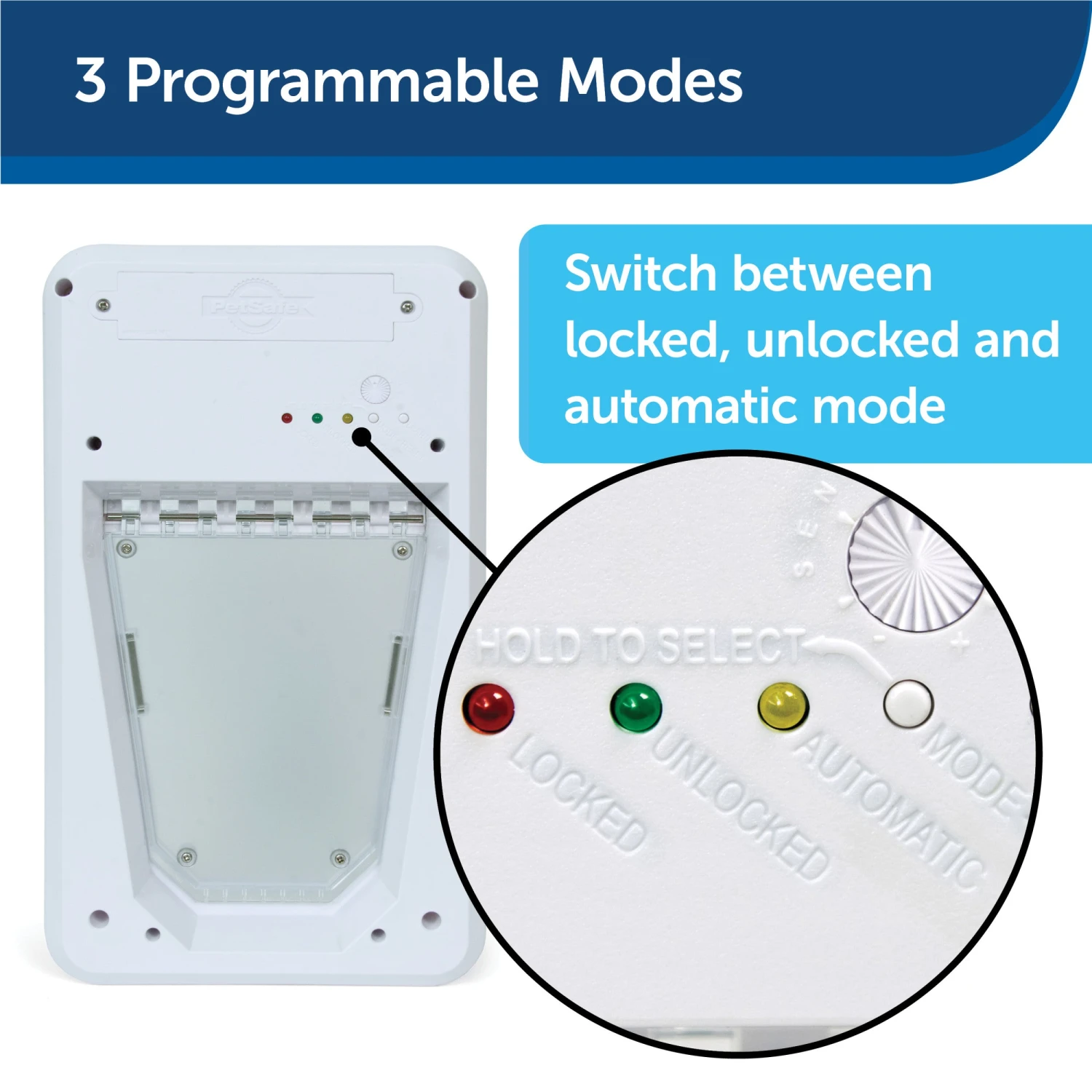 The SmartDoor™ can detect up to five programmed SmartKeys™ and also operates in two other modes: fully locked mode and unlocked mode. Locked mode does not allow entry or exit for any pet and unlocked mode allows entry and exit for all pets.