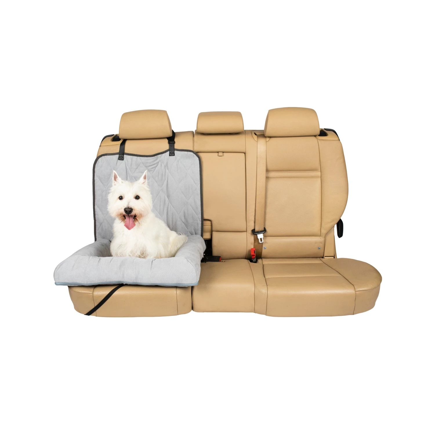 Let your best friend dream while you drive with the PetSafe® Happy Ride® Car Dog Bed. Your dog gets a cozy bed to give him the perfect combination of comfort and protection so he can snooze and relax as you head down the road together; you get a durable seat protector that covers your car seat to keep it free from hair and pet messes. The car dog bed works with any bench or bucket seat with a headrest. The soft, microsuede lining pairs with an over-stuffed bolster and cushion to provide a comfortable sense of security that will calm anxious or restless pups during long rides. Seat belt slits allow normal use of your car’s seat belts with the dog bed in place. This lets you use the optional PetSafe® Happy Ride® Seat Belt Tether (sold separately) for maximum safety. If your seat cover is ready to be cleaned at the end of a fun-filled day with your best friend, simply toss the cover into your washing machine. PetSafe® brand is here to help you and your pet live happy together™. Formerly Solvit™ brand – Packaging may vary