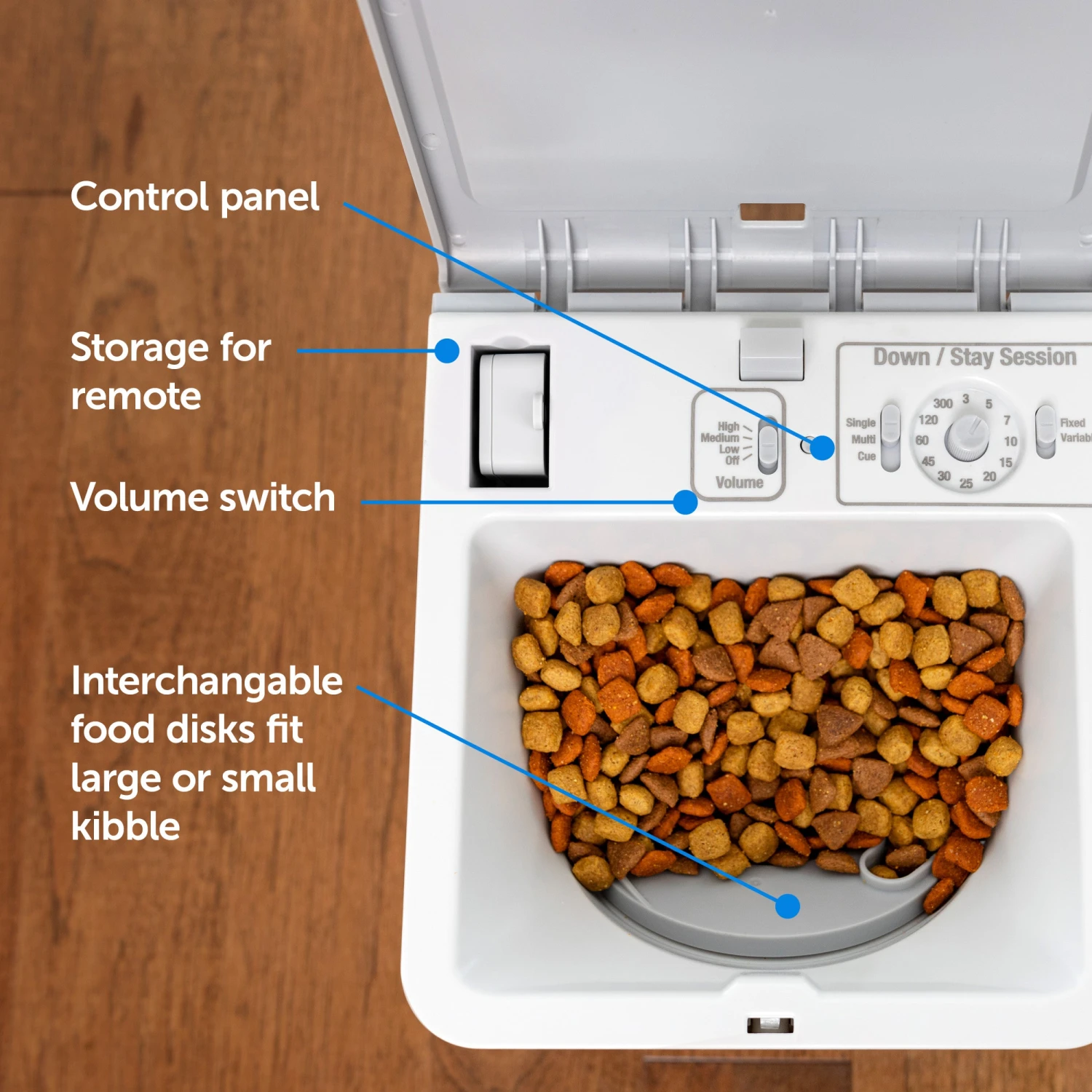 - Dispense kibble or treats from up to 30 yards away with remote control