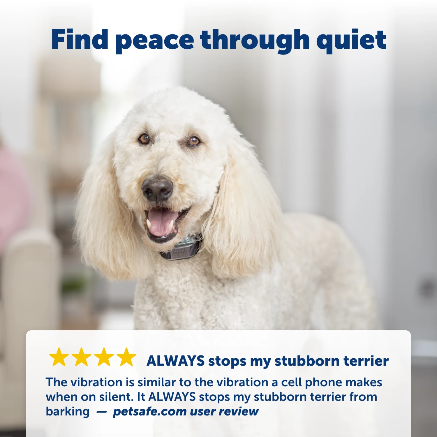 The PetSafe® Vibration Bark Control Collar offers 10 combinations of vibration correction. When the dog barks, vibration is delivered from one of the two Vibration Points. The duration of the vibration is random, which interrupts the dog’s bark.