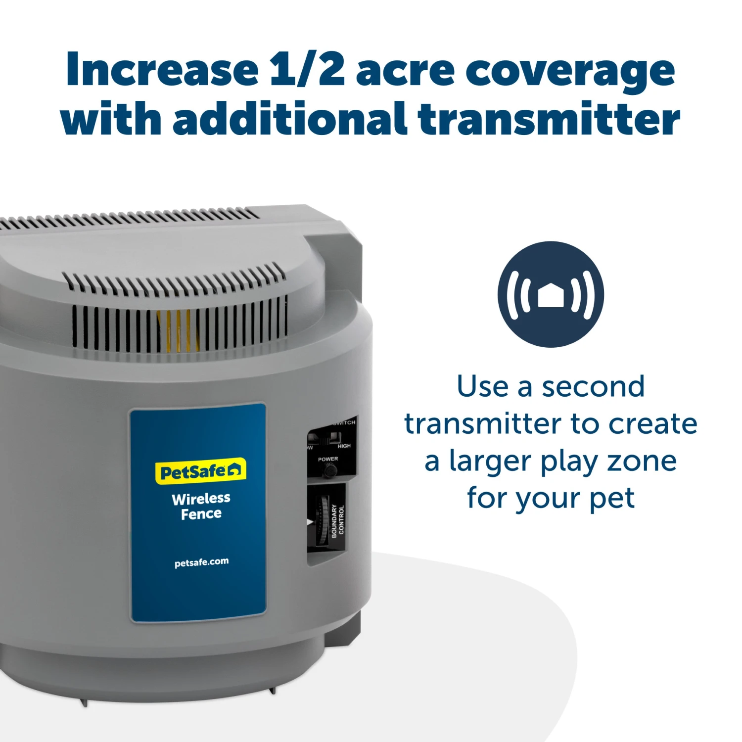 - Expand Your Boundary – Increase your pet’s play area with an extra transmitter. Transmitters boundaries need to overlap 30 ft.